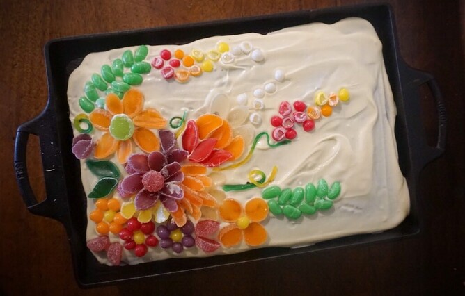 Allow to cool and ice and decorate as you like. Even a sprinkling of icing sugar and a scoop of ice cream over a warm slice is delicious.