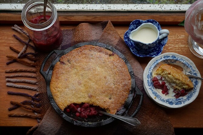 Carefully spread the sponge on top of the warmed fruit and place back in the oven to bake for 40 minutes. The sponge should be soft and spring back when lightly touched.