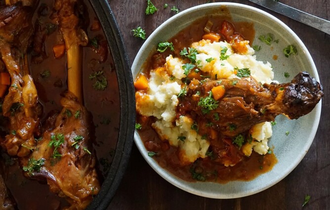 Pile a plate high with buttery mashed potato, add a shank, and pour over plenty of the rich tomato sauce. Sprinkle with fresh parsley and drizzle with more runny honey.