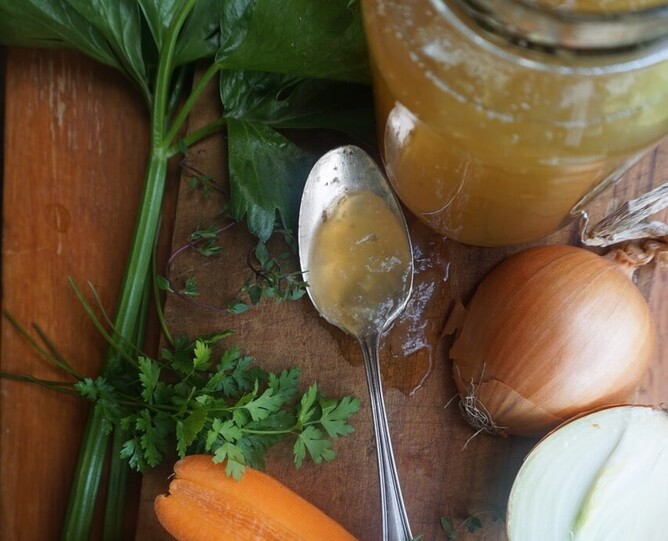 Vegetables add layers of flavour to the stock. Vegetable scraps work just as well as whole vegetables and are a great way to reduce food waste. Simply freeze veggie scraps throughout the week ready to be turned into stock.