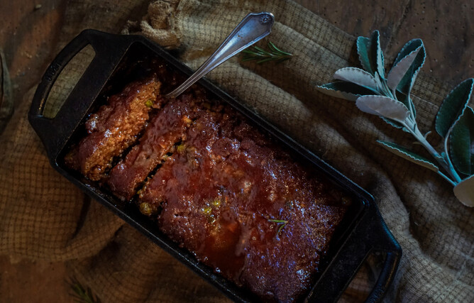 Place it back into the oven and bake for another 30 minutes, or until the sauce is sticky and the top of the meatloaf is starting to caramelise.