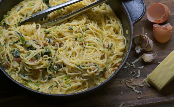 This is a deliciously easy carbonara where the egg and cheese are combined to create a creamy sauce. The ultimate midweek comfort food.