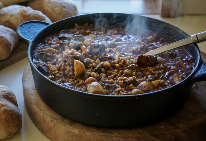 This beef and pearl barley stew is hearty and comforting, perfect for warming hands on a cold day.