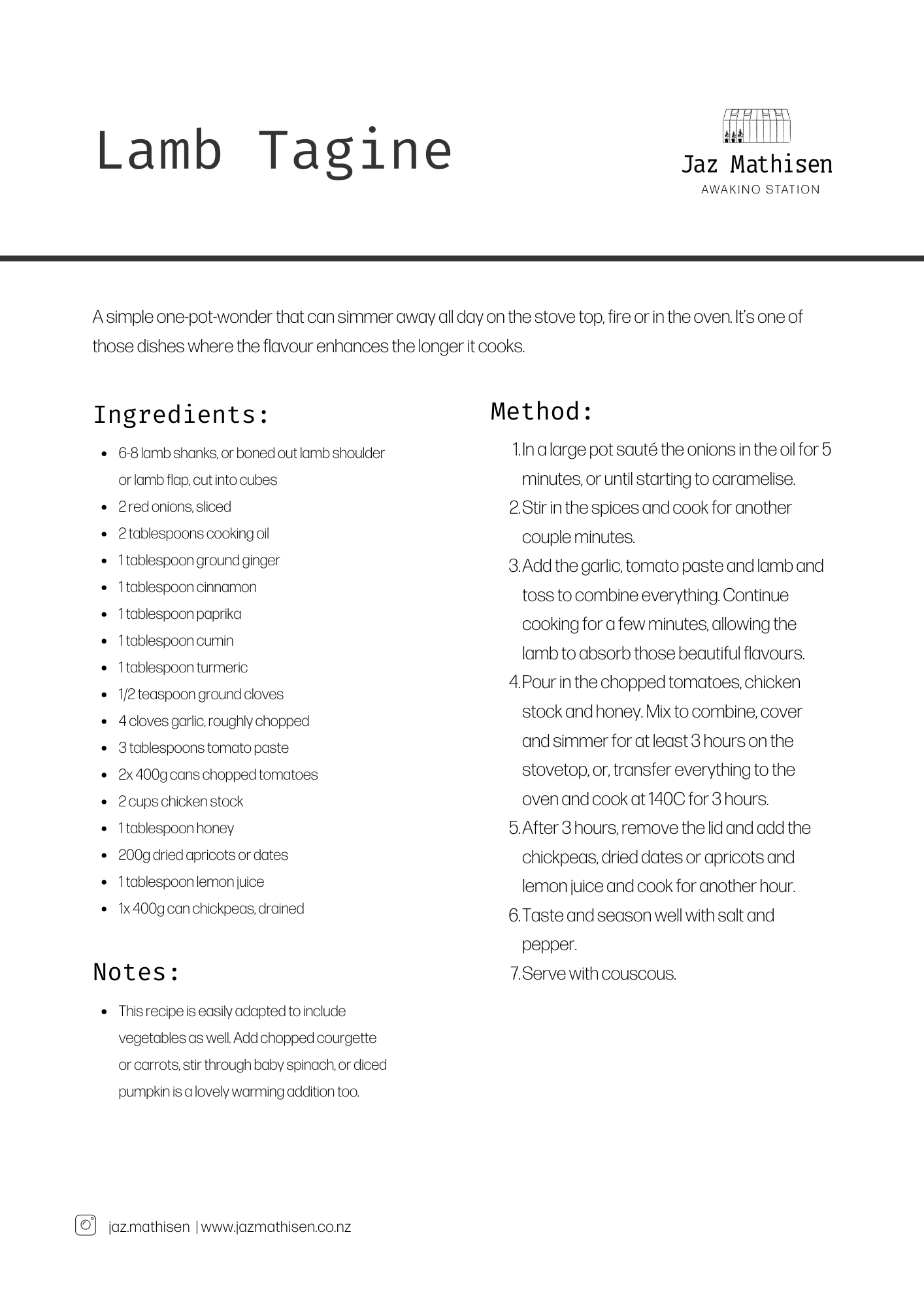 A simple one-pot-wonder that can simmer away all day on the stove top, fire or in the oven. It’s one of those dishes where the flavour enhances the longer it cooks.